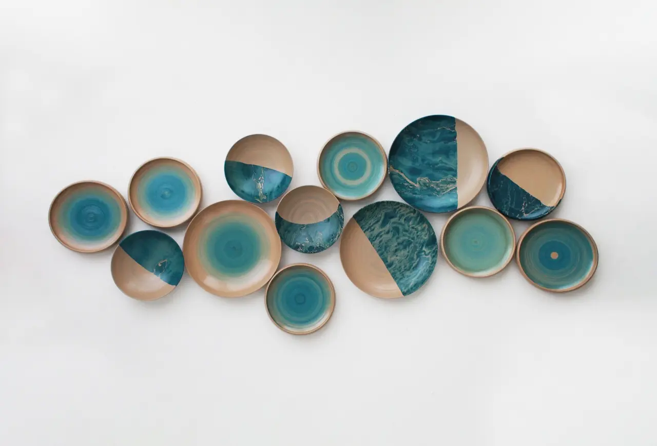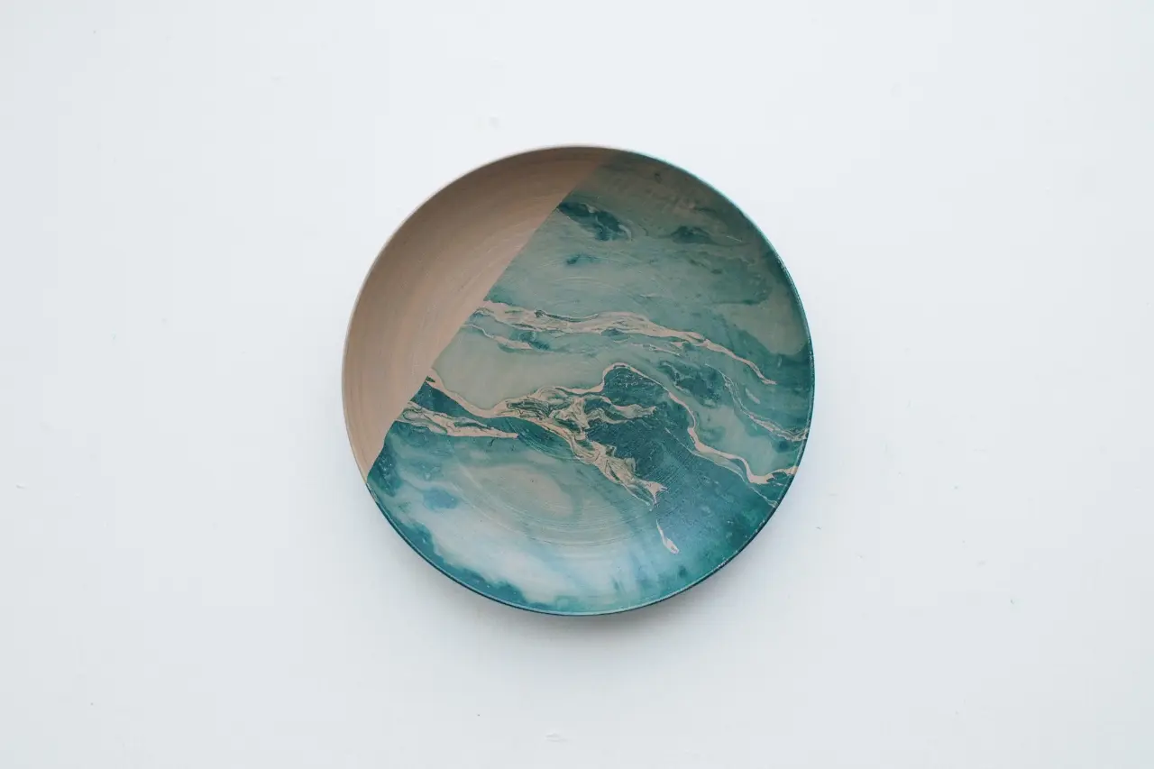 「墨流し」と呼ばれる、漆の変わり塗り技法を使って瀬⼾内をモチーフに現代的な漆器を制作しています。 ⽔⾯で作られる⼀瞬の模様を写しとって作られる波模様は 全て⼀点ものとなり同じものはありません。